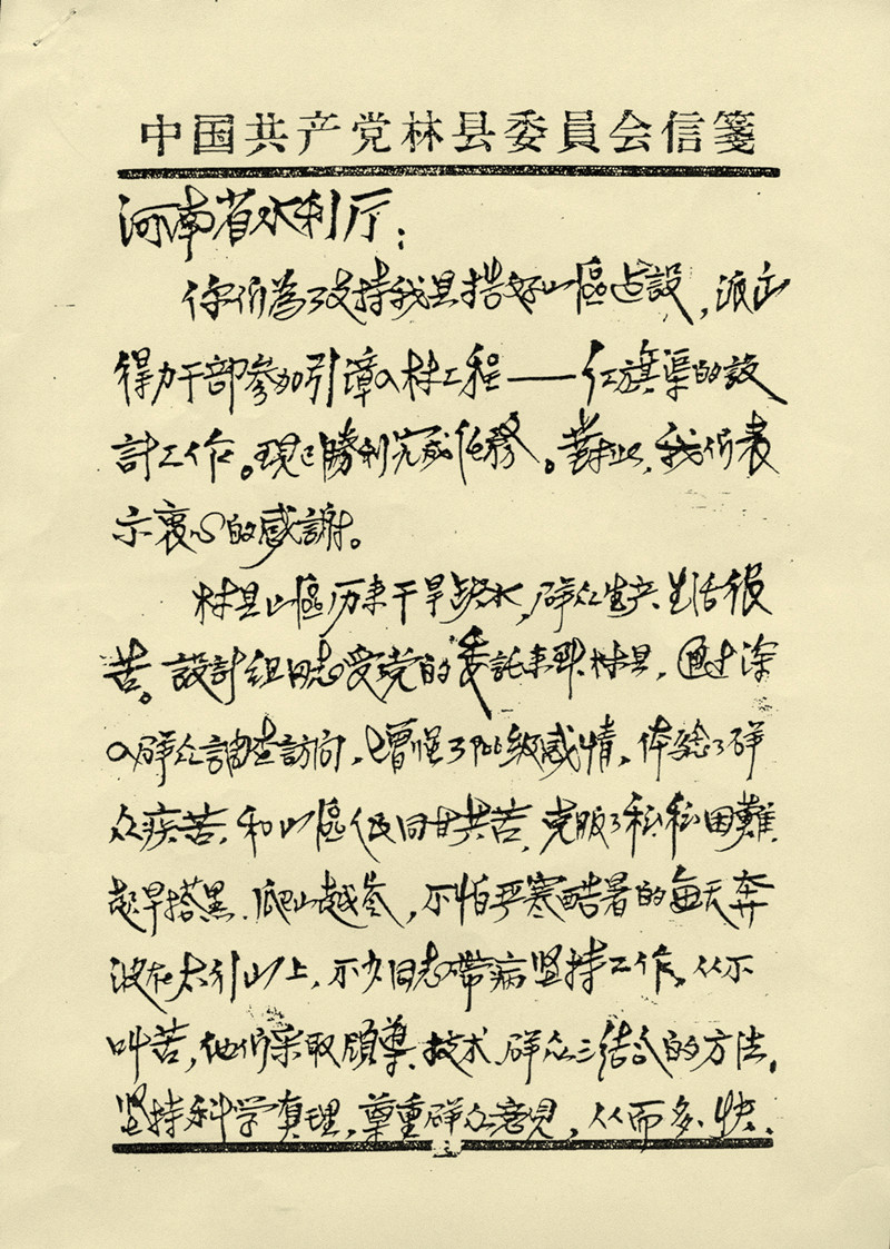 举世闻名的人工天����� ������������ �������Ƴ����������� �������Ƴ������������ �������Ƴ������������ �������Ƴ������Ƴ�������河——红旗渠,原为����� �������Ƴ������������ �������Ƴ������������ �������Ƴ������������ �������Ƴ�������林县自办工程,1960年因国家自然����� �������Ƴ������������ �������Ƴ������������ �������Ƴ������������ �������Ƴ�������灾害而停工。省水利厅设计院受����� �������Ƴ������������ �������Ƴ������������ �������Ƴ������������ �������Ƴ������水利厅委托成立红旗渠设计组,����� �������Ƴ������������ �������Ƴ������������ �������Ƴ������������ �������Ƴ�������经过三年的艰苦奋斗和科学设计,使红旗渠建设列����� �������Ƴ������������ �������Ƴ������������ �������Ƴ������������ �������Ƴ�������入国家基本建设项目。老一����� �������Ƴ������������ �������Ƴ����������� �������Ƴ������������ �������Ƴ�������辈豫水设����� ���������� �������Ƴ������������ �������Ƴ������������ �������Ƴ������������ �������Ƴ��������Ƴ�������计人为红旗渠的顺利实施提供了����� �������Ƴ������������ �������Ƴ����������� �������Ƴ������������ �������Ƴ�������有力的技术支撑,受到了省水利厅的嘉����� �������Ƴ������������ �������Ƴ������������ �������Ƴ����������� �������Ƴ�������奖和林县政府的书面表扬。工程设计流量����� �������Ƴ������������ �������Ƴ������������ �������Ƴ������������ �������Ƴ�������23m3/s,设计灌溉面积54万亩����� �������Ƴ������������ �������Ƴ����������� �������Ƴ������������ �������Ƴ�������。