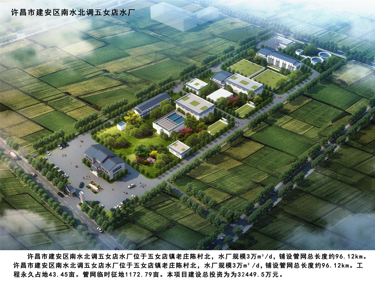 五女店水厂位于许昌市建安区,水厂规模3万m����� �������Ƴ������������ �������Ƴ����������� �������Ƴ������������ �������Ƴ�������³/d,配水管网按照一次规����� �������Ƴ������������ �������Ƴ������������ �������Ƴ������������ �������Ƴ�������划布置建设,铺设管网总长度约96.����� �������Ƴ����������� �������Ƴ������������ �������Ƴ������������ �������Ƴ�������12km。