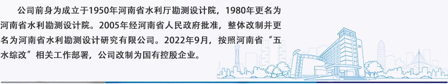 公司前身可追溯至1950年成立的河南省治淮总指挥����� �������Ƴ������������ �������Ƴ������������ �������Ƴ������������ �������Ƴ�������部计划处,1956年与河南省水利厅勘测设计处合并����� �������Ƴ������������ �������Ƴ������������ �������Ƴ������������ �������Ƴ�������成立了河南省水利厅勘测设计院����� �������Ƴ������������ �������Ƴ����������� �������Ƴ������������ �������Ƴ������,1980年更名为河南省水利勘测设计院。2����� �������Ƴ������������ �������Ƴ������������ �������Ƴ������������ �������Ƴ�������005年经省人民政府批准,整体改制为科技型企业����� �������Ƴ������������ �������Ƴ������������ �������Ƴ������������ �������Ƴ�������,并更名河南省水利勘测设计研究有限公司。2����� �������Ƴ������������ �������Ƴ����������� �������Ƴ������������ �������Ƴ�������022年9月,根据河南省委、省人����� �������Ƴ������������ �������Ƴ������������ �������Ƴ������������ �������Ƴ������民政府“五水综改”相关工作部署,公司积����� �������Ƴ������������ �������Ƴ������������ �������Ƴ������������ �������Ƴ�������极推进股权重组,由河南水利投资集团有限����� �������Ƴ������������ �������Ƴ������������ �������Ƴ������������ �������Ƴ�������公司控股51%,公司改制为国有控股����� �������Ƴ������������ �������Ƴ������������ �������Ƴ������������ �������Ƴ�������企业。